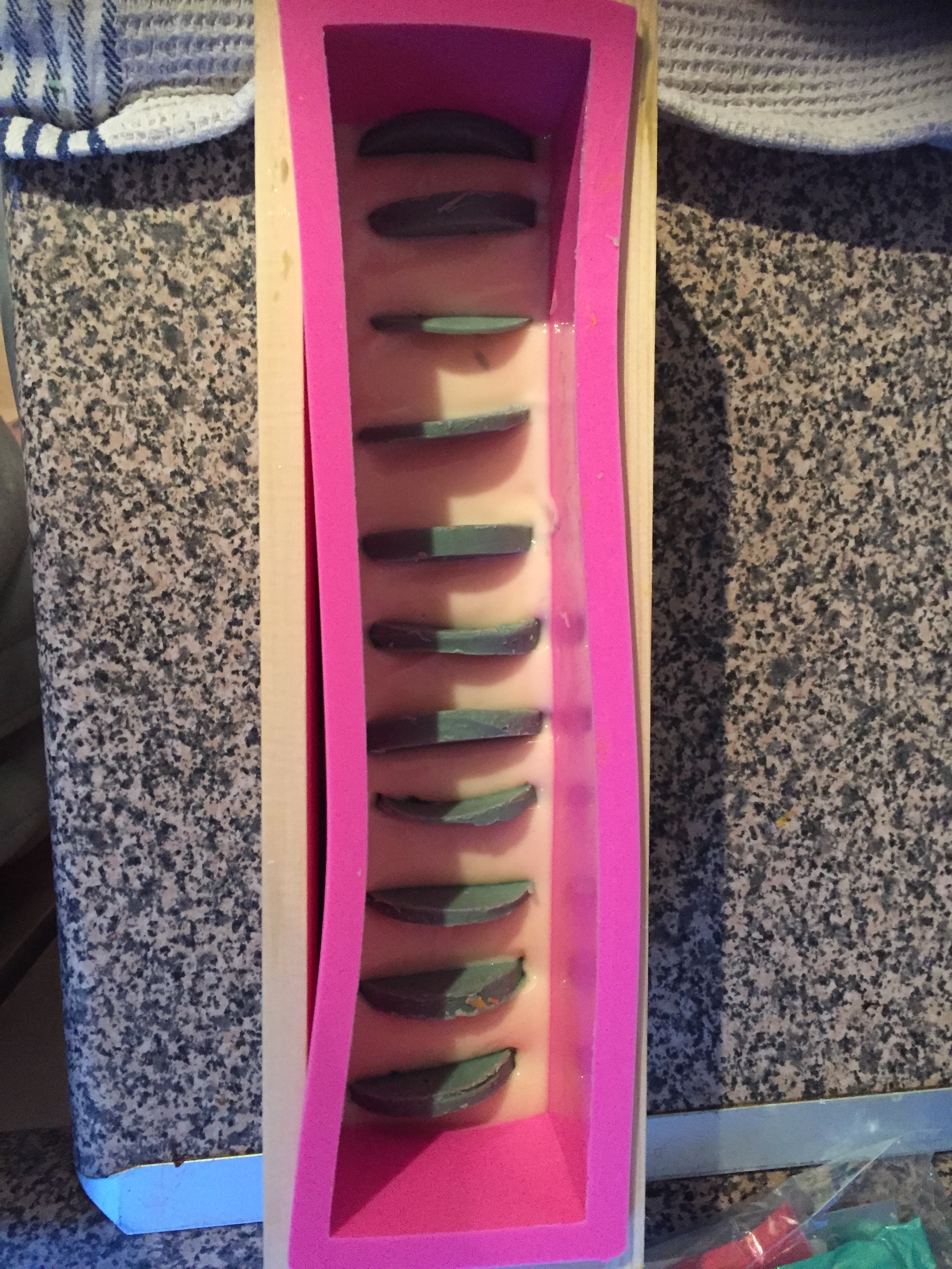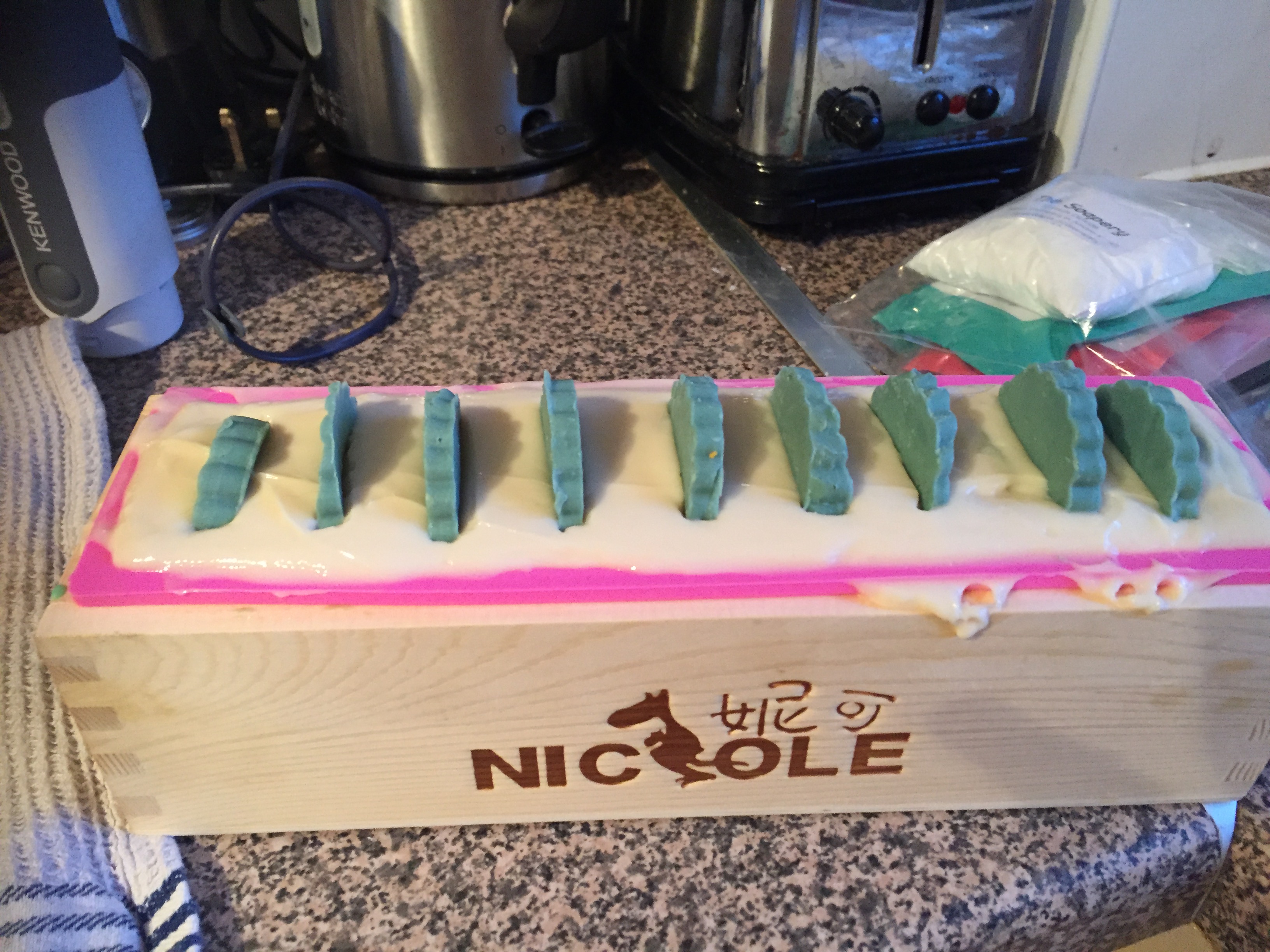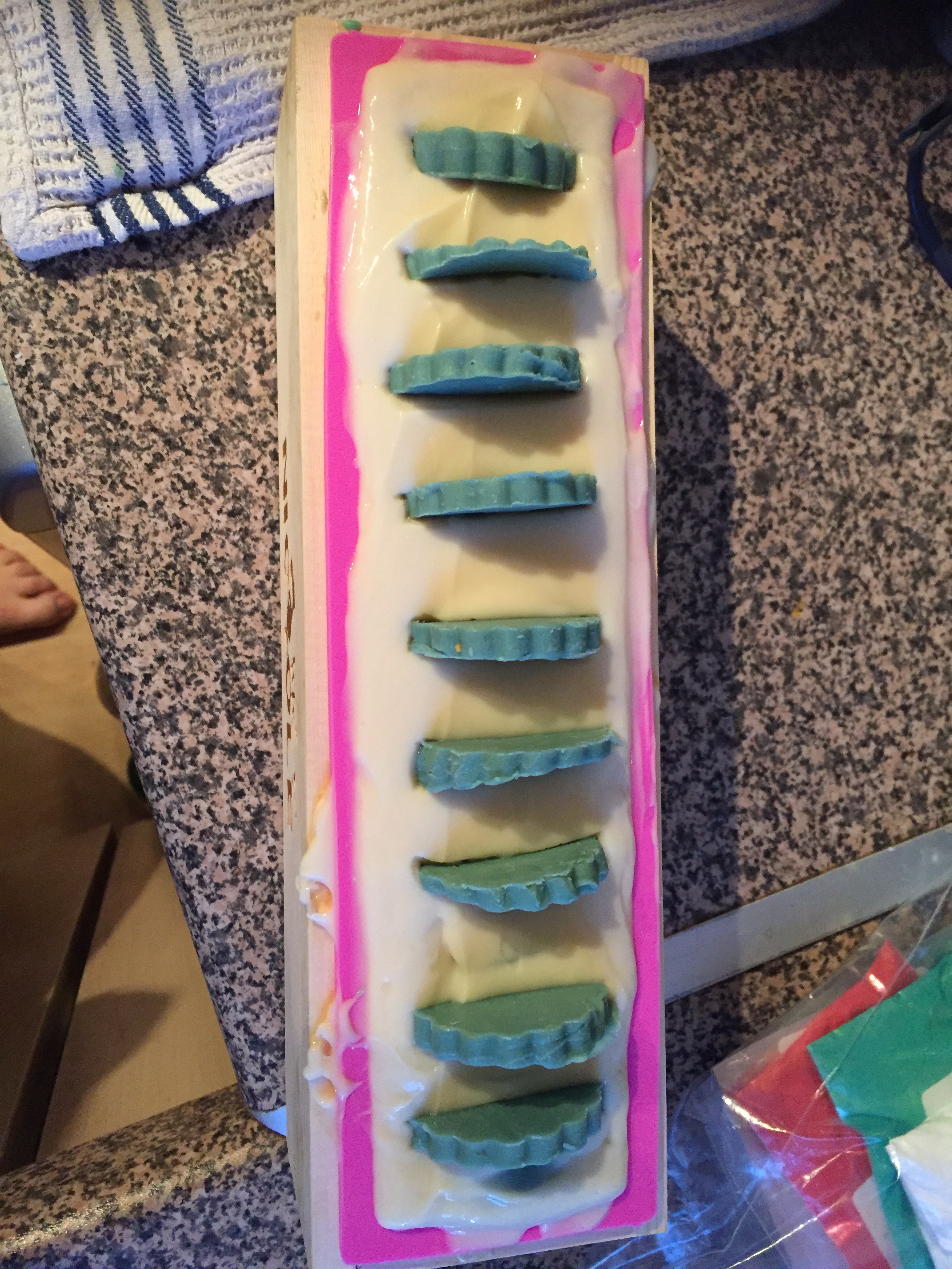 I wanted to make a soap that looked and reminded me of that glass, an opaque base with green half slices embedded. I had to make these in two separate batches, which took 2 days to complete.